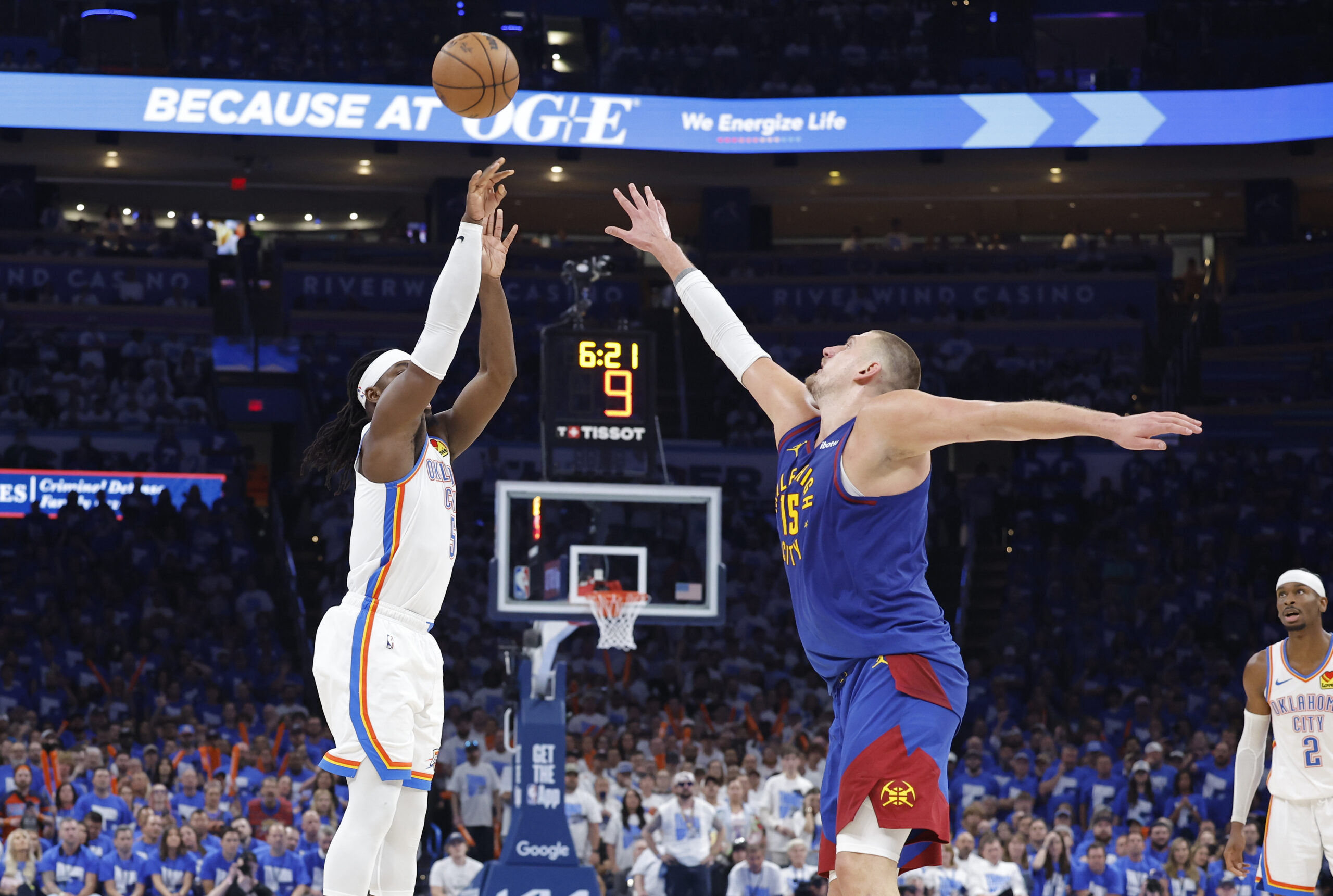 ...Defend Nikola Jokic (Seriously)May 13, 2025; Oklahoma City, Oklahoma, USA; Denver Nuggets center Nikola Jokic (15) is defended by Oklahoma City Thunder forward Chet Holmgren (7) on a drive during the first quarter of game five of the second....