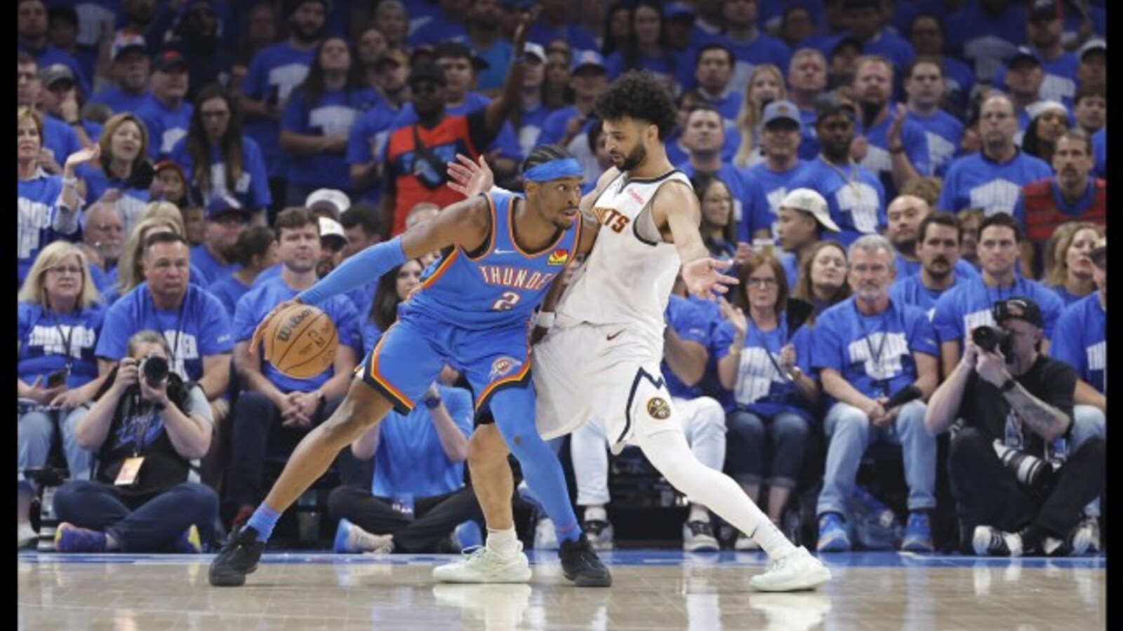 As for the NBA late gameat Oklahoma City, the thunder of taking the lead onthe Denver Nuggets eighty six eighty five with under tenminutes to go, thirty two points so far for Shaygilgis Alexander. He's returned for OKC after missing nine....