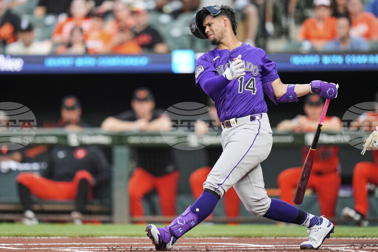 Rockies Orioles BaseballColorado Rockies' Ezequiel Tovar (14) strikes out swinging during the first inning of a ... inning of a baseball game against the Colorado Rockies, Saturday, July 26, 2025, in Baltimore. (AP Photo/Stephanie....